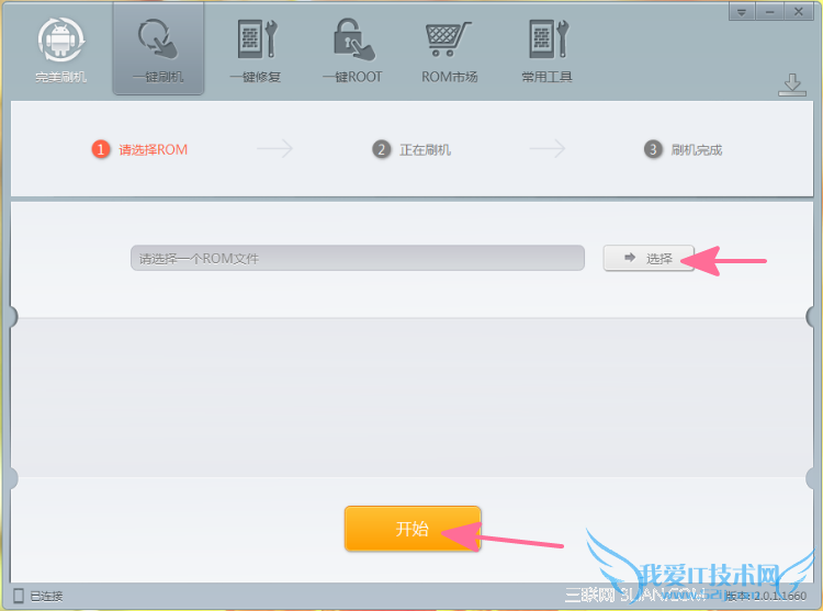 途径二:如果刷机之前你就已经准备好HTC one X刷机包,请直接切换至“一键刷机”页面,点击“选择”,选定你已经准备好的rom包,点击页面下方的“打开”,将rom添加到主页面的选项框后,点击“开始”就立即运行刷机软件了。