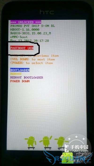 3.按下电源键切换到fastboot界面,并且可以看见红框的“FASTBOOT USB”字样