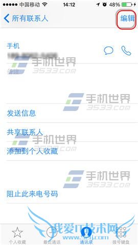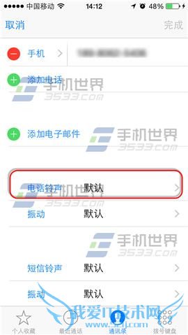 1)打开iPhone6【通讯录】,点击要设置铃声的联系人,点击【编辑】,选择【电话铃声】。(如下图)