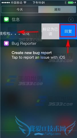 下拉出通知中心后,在通知一栏中【向左】滑动信息栏,点击弹出的【回复】按钮即可。(如下图)