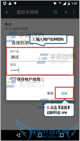 2)点击【测试】,输入你的用户名和密码,点击【连接】即可开启VPN。(如下图)