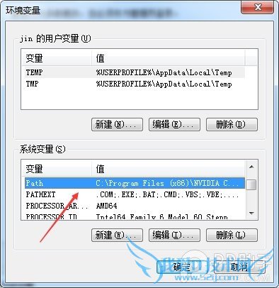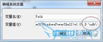 3、 修改系统变量中的Path,在Path后面加上ADB工具的目录。比如我是将ADB工具目录放在了D盘下,添加的路径就是D:adb