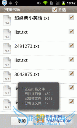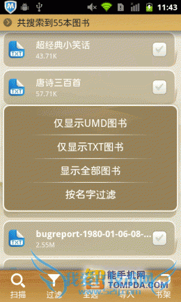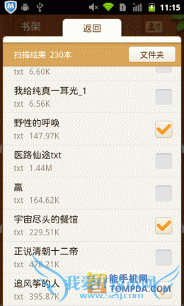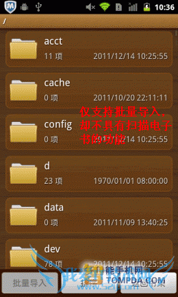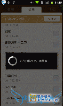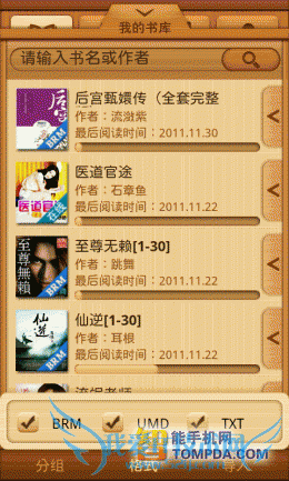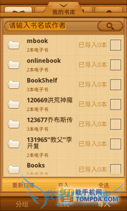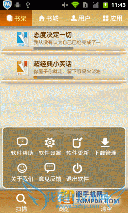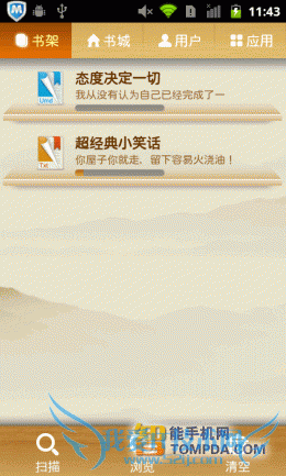 掌上书院的界面与百阅有几分相似,带有阅读进度条的书籍,以列表形式显示在书架上。扫描、浏览和清空三个功能位于界面下方,便于使用。掌上书院会将手机中的umd和txt等电子书扫描出来,并提供批量导入功能。