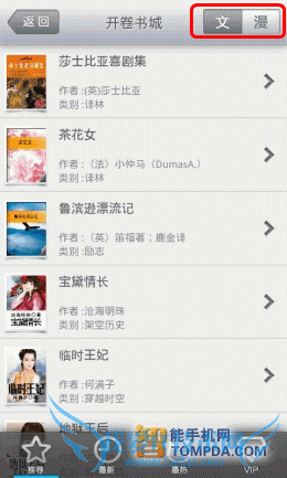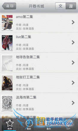 进入开卷书城,在这里有四个界面:推荐、最近、最热和vip,每个页面中书籍只分为两类,文字书籍or漫画。面对这样简单的书籍分类,如果用户偏爱某类书籍,搜索起来会比较费劲。至于漫画,在开卷书城中的漫画都是国产漫画,不过数量似乎有点儿少,因为推荐页面中的书重复率很高。