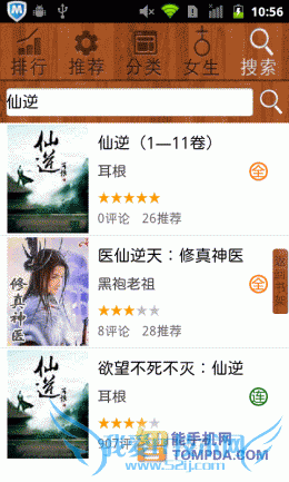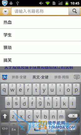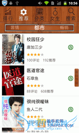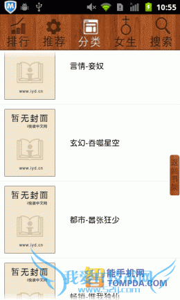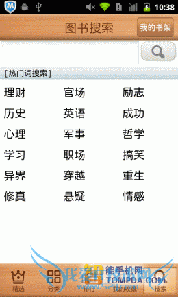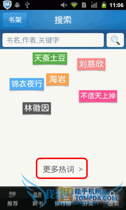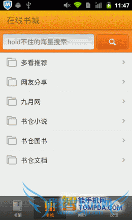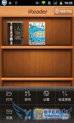 掌阅书城iReader:尽管软件支持批量导入手机中的电子书,但却不提供智能扫描功能,搞的用户只能在SD卡的文件堆里翻,麻烦,不够人性 化。网络书城中,书籍的分类做得很细致,而且加载速度也比较快比较稳定,只不过有一点让我不解,搜索页面中的“热门词汇”怎么万年不变啊?改为“搜索类 别”差不多。至于iReader的手势操作,数量为0,不过为用户提供的个性化设置很丰富,算是功过参半吧。