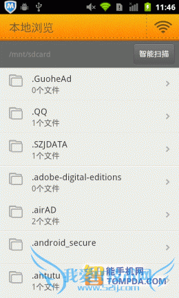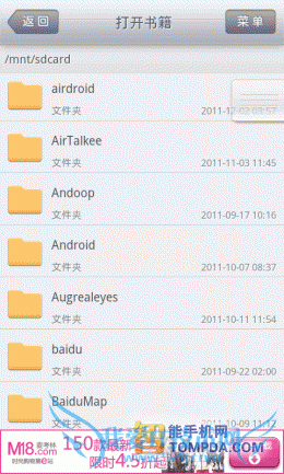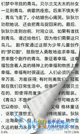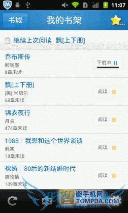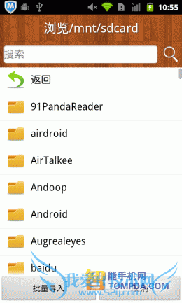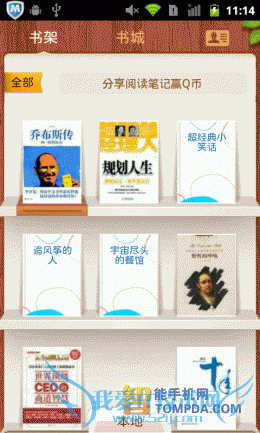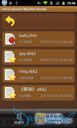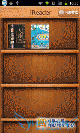 掌阅书城iReader,一款简单到初次使用的人都可以轻松上手的手机阅读器,以书架作为背景,一本本书堆叠其中。掌阅书城支持 TXT,UMD,CHM,HTML/HTM,PDB,EBK2,EPUB等多种手机阅读格式的电子书阅读软件,不过它并不支持扫描本地书籍的功能,用户需要打开文件夹列表,自己去将手机里的电子书翻出来,比较麻烦。