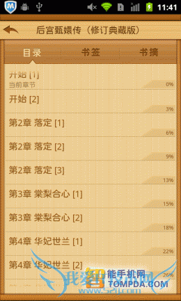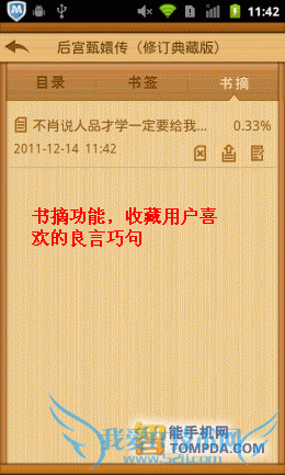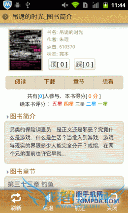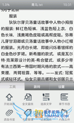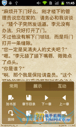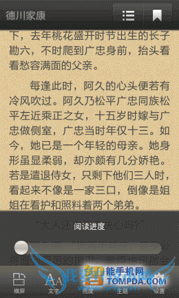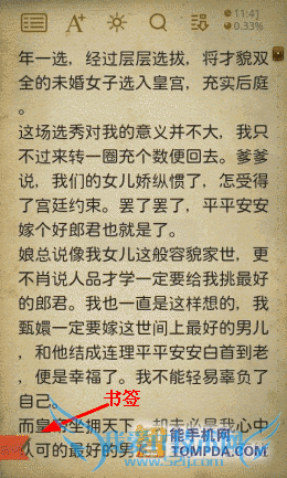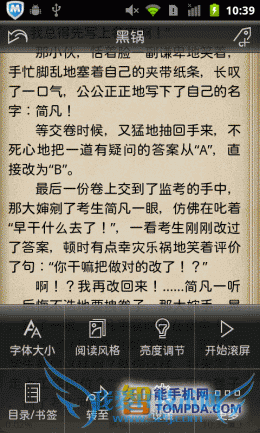 打开一本书,羊皮纸风格上的字体大小适中,用户可以通过自动滚动功能来解放双手。在界面的左下方有个按钮,它可以快速添加书签,非常方便。另外,在按下手机的Menu键后,你可以通过菜单修改主题、行间距、滚动速度等。