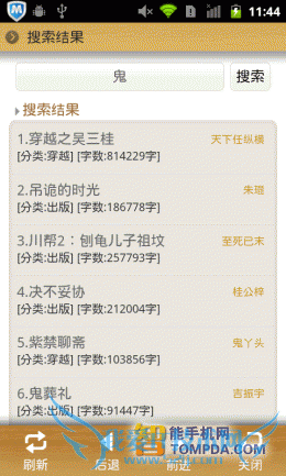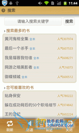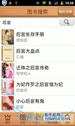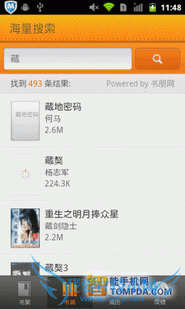 我们在刚对比各手机阅读软件的网络书城时已经看到了,掌上书院的网络书城时以网页形式显示的,搜索功能当然也不可幸免。所以搜索页面加载速度很慢,搜索的进度也受到牵连,带来的用户体验很糟。