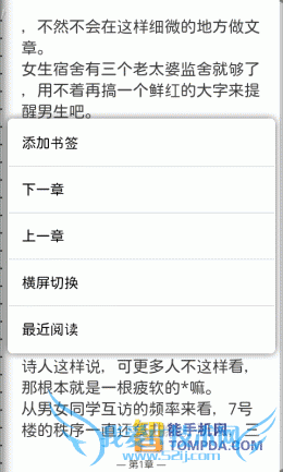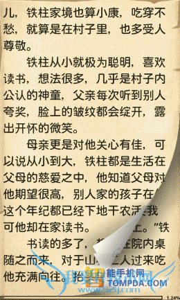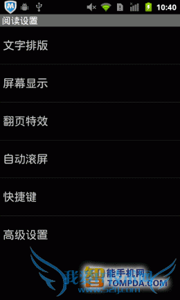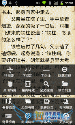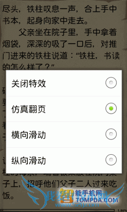 不用多说,GGBook也使用了仿真翻页特效,不过手势操作很少,需要按Menu键才会显示菜单。阅读设置可以满足一般用户的基本需求,调整字体、背景、亮度等,如果你是个对个性化设置要求比较多的用户,那么GGBook的阅读设置就略显单薄了。