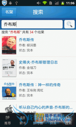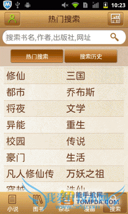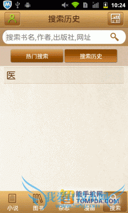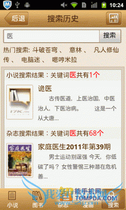 在熊猫看书的搜索页面中显示多许多近期的热门关键词,乔布斯、穿越、仙逆等等。另外,软件还会保存用户的搜索历史,便于用户以后的搜索。小说、图书、杂志等不同类型的书籍会在搜索结果中分开显示,很有条理。