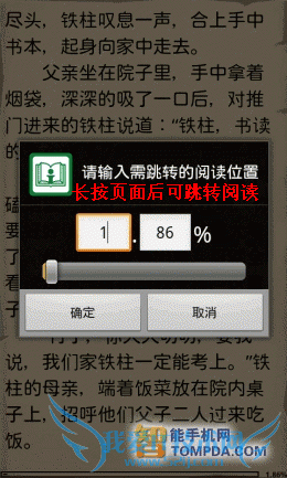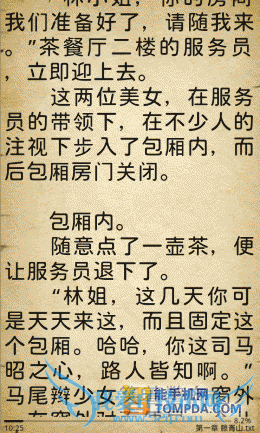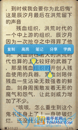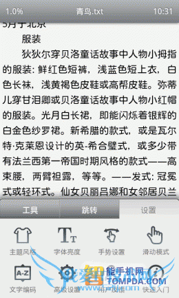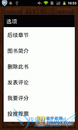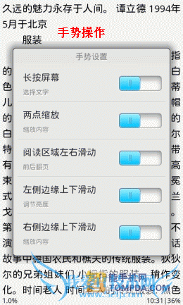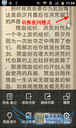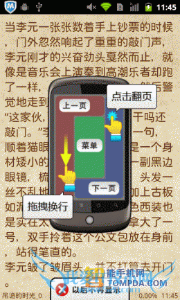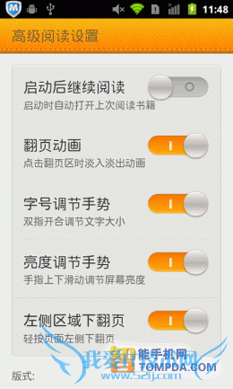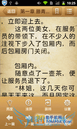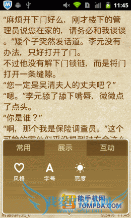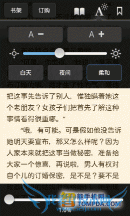 在i悦读中翻开一本书,按照惯例,软件显示了操作方法,除了以往的操作以外,又新增了一个快捷调节屏幕亮度的手势操作。按下手机的Menu键后你会发现,更新后的阅读设置比以往更加细致,而且调节方式更加人性化了,你可以通过设置菜单调节皮肤、背景颜色、文字大小等。