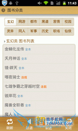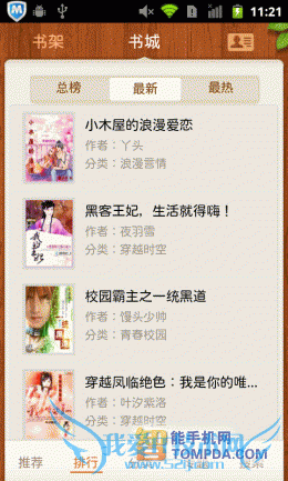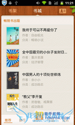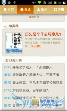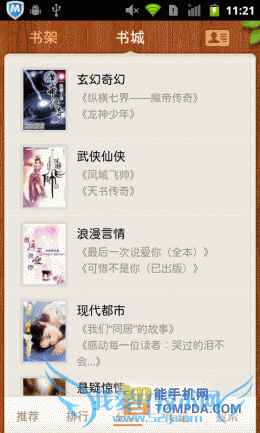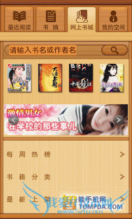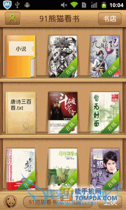 在进入91熊猫看书后,你会看到书架中已有不少内置书籍,从中也可看出,软件支持在线阅读功能。在熊猫看书的网络书城中,小说、图书、杂志和漫画各有独立的页面,并按照类型分类,非常清晰。网络书城中的书籍来自不同的文学网、出版社和原创小说网站,唯一不足的是,页面加载速度不快,试想如果是在地铁上浏览网络书城,估计会抓狂。