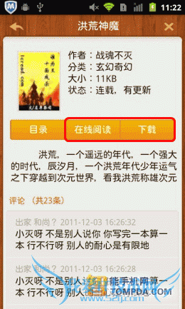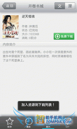 在开卷有益的网络书城中选择一本自己感兴趣的书,点开后,你可以看到这本书的作者、大小、简介等等,如果你想阅读,只能待下载完成后才行,因为开卷有益不支持在线阅读功能。开卷有益中的文字书籍大小从几百KB到1MB不等,而漫画则比较大3MB一集算是正常的,最大的看到过6MB一集的,流量有限的同学最好用WiFi下载。
