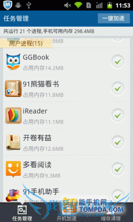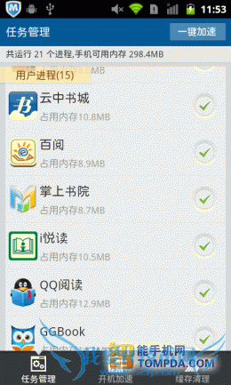 考虑到有些安卓手机的内存不大,而现在很多软件都会在后台运行,所以小编测试了一下在闲置状态下,每款手机阅读软件占用的内存大小。其中,GGBook占用的最大,其次是QQ阅读,而占用内存最少的,是百阅和掌上书院。