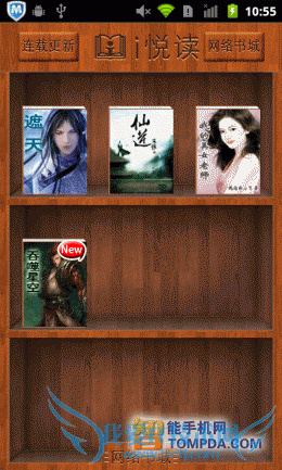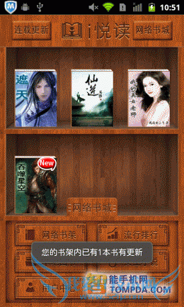 i悦读以古朴的木质书架为背景,最近阅读过的小说显示于主界面中。由于i悦读支持小说连载提示,所以当章节更新后,小说的略缩图上会标以红色的 “New”字样。在软件界面下方有一个可拖动的菜单,里面显示了流行排行、女生小说等进入网络书城不同页面的快捷键,还显示了本地图书和网络书架按钮,其中网络书架是i悦读提供的一个网络存储空间,用户可以将电子书、音频等文件存储于其中。