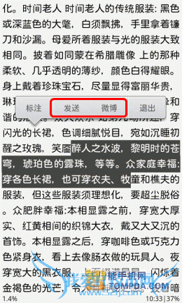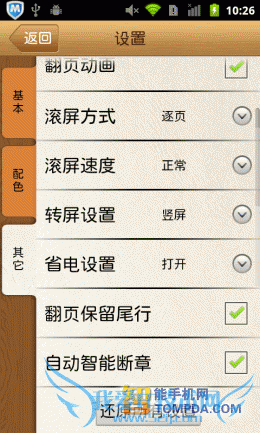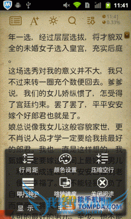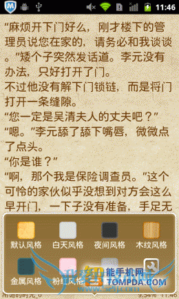 虽然掌上书院的网络书城带来的操作体验不好,但是他的阅读操作却比较不错,常用设置、显示设置,乃至书评等功能,一应俱全。不仅如此,他还支持自定义显示风格。