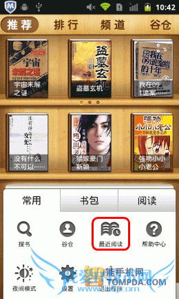 GGBook的首次启动速度有些慢,不过在以后的使用中,启动速度有所好转。在进入软件之后,会直接看到网络书城,而不是近期浏览的图书。按下手机Menu键后,通过快捷按钮才可进入浏览最近阅读。这样的设置对于不利于用户后续阅读,徒增操作步骤。