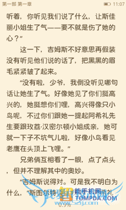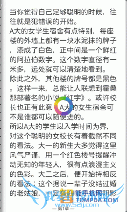 在多看阅读中打开一本书,默认字体大小适中,以左右切换的方式翻页。多看阅读的手势操作是它的一个亮点,双指开合滑动可以调节字号,而手指上下滑动则可以调节亮度,很便捷。