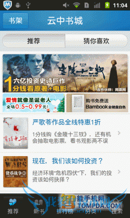云中书城界面相比前几款软件来看相当简单,但是却大有内容,它囊括了盛大文学旗下起点中文网、红袖添香、小说阅读网、榕树下、潇湘书院等网站内容,书籍资源很丰富。云中书城中,网络文学与传统图书是分开的,满足不同喜好的人的需求。