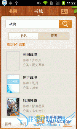 QQ阅读的搜索功能支持搜索热词,在搜索时,软件会按照书名和作者进行搜索,并分类显示于搜索结果中,通过点击“书名”或“作者”用户 而已切换与两个列表之间。与此同时,QQ阅读支持在线阅读和下载功能,在点击“下载”后,软件会在后台自动下载图书。