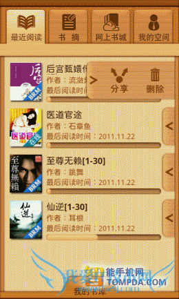 百阅采用了木质风格的界面,最近阅读、书摘、网上书城以及个人空间显示在界面上方,在界面中,显示着最近阅读过的书籍,通过旁边的按钮可以分享或删除你所浏览的书籍。在“我的书库”中,书籍按照分组和格式显示,便于用户查找,而至于扫描本地图书,则可能会耗费用户十几秒的时间,这完全取决于SD卡中的文件数量了。