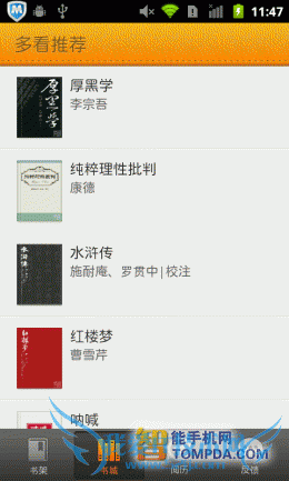 相对于前面几款软件来说,多看阅读的书城显示的非常简洁,与云中书城差不多,而且书城的加载速度良好。书城中的书籍均为免费下载内容,所以资源自然不及其他几款手机阅读软件。