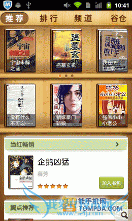 进入i悦读的网络书城,感觉加载速度很快,几乎无需等待。i悦读接入了起点小说网的书库资源,所以网络小说以原创居多,而且有很多都是连载小说,当然你也可以找到一些书店里的畅销书。网络书城包含了排行、推荐、分类、女生频道和搜索,5个页面,而小说则被按照言情、玄幻、畅销、悬疑、管理、笑话等分为了19类,很细致。