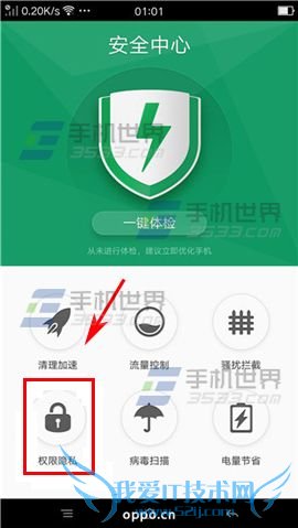 1)进入OPPO R7Plus的安全中心,点击【权限隐私】,再点击【程序加密】。(注:OPPOR7Plus程序加密的方法请参考相关教程)(如下图)