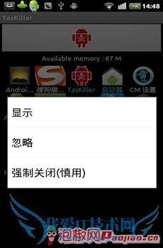 参评软件:任务杀手TasKiller、进程自动查杀AutoKiller、高效任务杀手Elegant Task Killer、高级任务杀手Advanced Task Killer