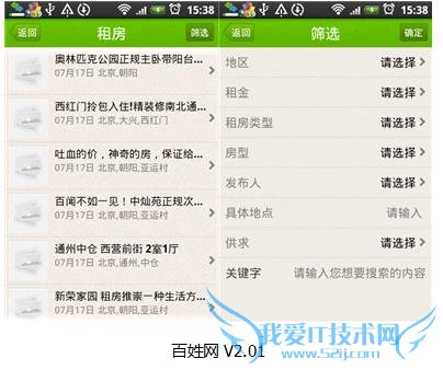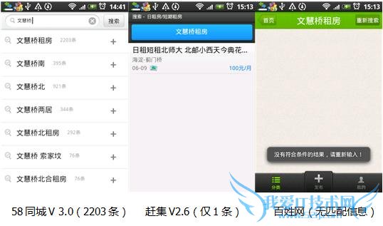 目前正值毕业季,许多走出校门的大学生迫切的需要租房,找工作等各类生活服务类的信息。而时下炙手可热的生活信息服务类网站,非58同城和赶集网、百姓网莫属了。从去年开始,这三家公司集中发力于无线领域,纷纷推出客户端产品以满足用户在移动端的需求。那么,这三款应用又各自有什么优势呢,今天,笔者就代替各位同学,以租房为例,通过搜索“北京海淀区文慧桥附近一室一厅”的房子,分别对58同城、赶集网、百姓网这三款 Android平台的应用做一个全面的评测,体验一下这三款应用,希望给广大用户参考。