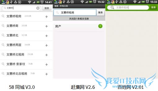 在三款应用上使用搜索功能时,58同城无线客户端3.0版本的搜索功能和google一样可以进行词语联想,在笔者输入“文慧桥”后,能快速联想出“文慧桥租房”、“文慧桥南”、“文慧桥两居”等关键词,还显示了相关信息条数,非常强大。