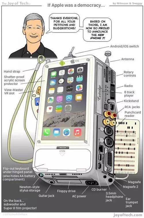 外媒表示,虽然苹果的每次的改变都会招致部分用户的反对,但时间证明苹果的做法事实上是促进了行业的发展的。看到这次果粉们如此群情激愤,外媒干脆顺着“民意”,加入了各种被苹果抛弃但被果粉怀念的元素,构想了“果粉当家的iPhone 7长这样”的模样,是不是美哭了呢?