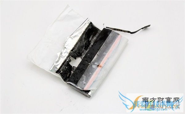 在剥开铝塑膜之后就是电芯内部了。在打开保护套的时候没有电解液流出,靠近可以闻到非常细微的刺激性气味。iPhone 4s电池内部采用了卷积的层叠结构,同样具有隔膜和金属电极。