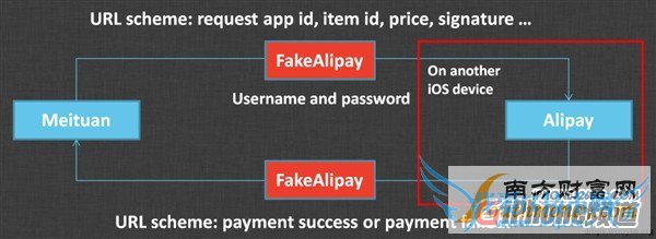 演示视频中“伪装”成支付宝的“FakeAlipay”,在收到美团发来的订单信息后,生成了一个和支付宝一样的登陆界面,用户在输入帐号密码后,FakeAlipay会把账号密码以及订单信息发送到黑客的服务器上,黑客获得这些信息后可以在自己的 iOS 设备上完成支付,并把支付成功的 URL Scheme 信息发回给FakeAlipay,FakeAlipay再把支付成功的 URL Scheme 信息转发给美团,这样就完成了一次被劫持的支付。