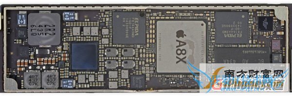 iFixit的拆解还证实了更为强大的A8X处理器的存在以及2GB Elpida F8164A3MD RAM,这两个单独的1GB RAM芯片分别位于A8X处理器的两侧。从Elpida的RAM排序体系来看,其中的数字8表示每个芯片为1GB,若是2GB则会标明“A”。