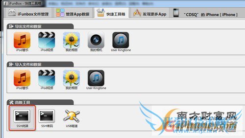 点击“快捷工具箱”后再点击高级工具的“SSH终端”,注意第一次连接时会提示你修改原始密码,不建议i-Funbox来修改,怕到时候不知道密码,可以以后再自行修改