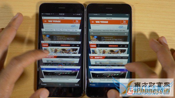 外媒 iDownLoader 利用 iPhone 6s(右)和 iPhone 6 进行了一次对比测试,测试项目是在 Safari 浏览器中中打开同样数量的网页,然后在这些网页间切换。