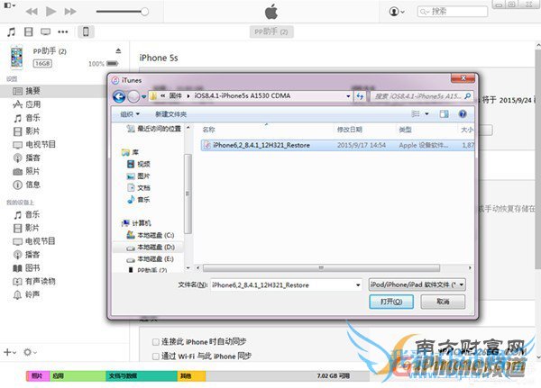 3、设备连接iTunes,按住Shift键之后点击“恢复iPhone”,选择已下载好的iOS9.0.2固件,等待更新完成即可。