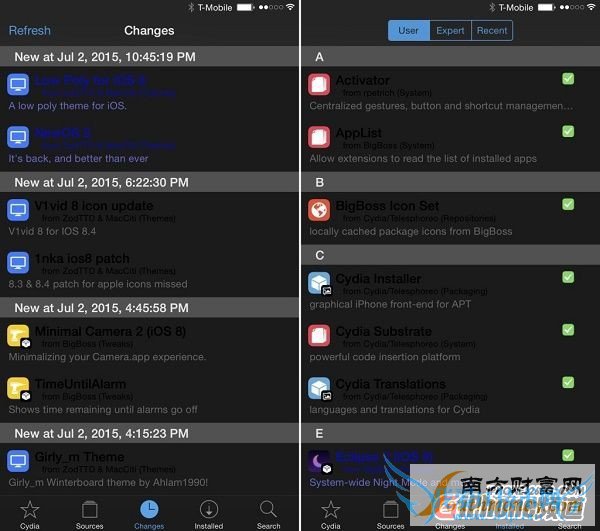 举例来说,若手机上安装有修改界面风格的插件,更新至 1.1.19 后 Cydia 的外观也会随之改变(如下图所示的夜间模式显示修改)。此外,功能性的插件同样适用,比如修改键盘样式。
