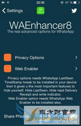 《WAEnhancer8 (iOS8)》是一款针对IM软件WhatsAPP的增强插件,它可以解除掉WhatsAPP的许多限制,比如可以发送2G的媒体文件、解除发送照片的限制、修改字体大小、聊天气泡等等。更新内容:添加聊天气泡的颜色选项,修复一些发生崩溃的问题。