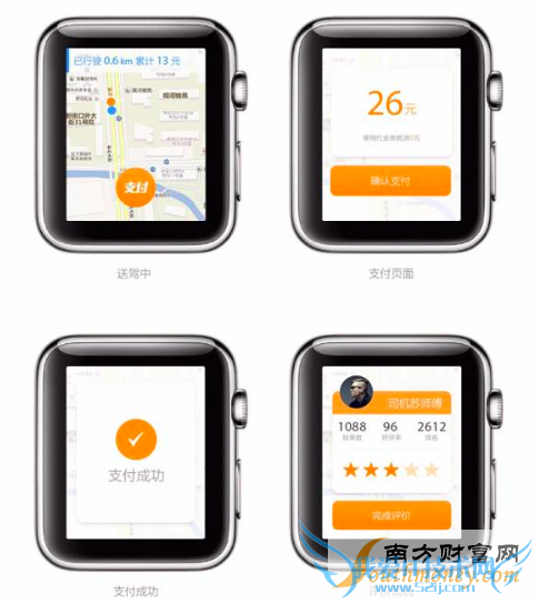 最积极的是滴滴打车,他们甚至还做了 H5 页面来推。从 UI 上来看,滴滴已经把各个应用环节的 UI 都展示了出来,包括发单、支付在内的将近 10 个使用场景。虽然针对手表屏幕进行了重新的设计,但是整套 UI 还是沿袭了手机版滴滴的设计风格。他们甚至连名字都想好了,叫做「滴滴 one(腕)」。