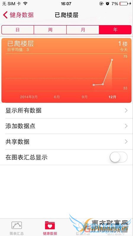 iPhone6内置了健康应用,虽然升级了iOS8的老款iPhone也有这个应用,但是因为没有气压计,健康应用就不能发挥它的所有作用。健康应用不仅能够记录步数、走路/跑步距离,还可以测试已爬楼层数,这就需要气压计的工作了。iPhone6用户进入“健康应用”,点击健康应用选项卡,进入健身数据,在健身数据里点击已爬楼层,进入后下拉刷新一下就能看到已爬的楼层数据了。