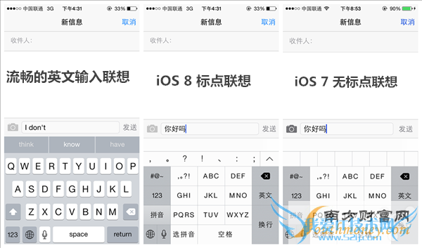 用“叹为观止”来形容 iOS 8 的英文输入法可以说是毫不为过。如果你是做外贸或者是从事英语行业工作的,我一定推荐你使用原生的 iOS 8 键盘输入法。苹果第一次开放了键盘供开发者开发第三方的键盘输入法,而且是否授权使用这些第三方的输入法,使用权也是在你的手中。只要打开英文键盘,就能够看到 3 个备选的单词,每输入一个字符,候选的单词都会进行更新或为你进行修正。而且随着你游标的移动,也会发生相应的联想改变。