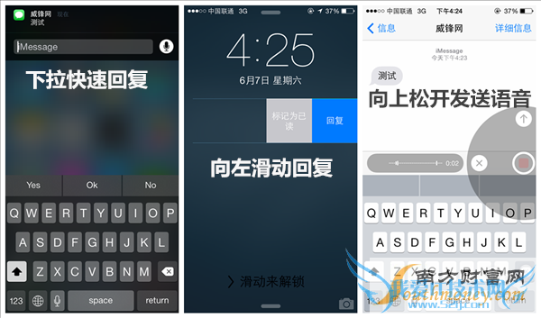 苹果这次其中一个大受称赞的升级就是增加了信息的快速回复,当信息弹出的时候,无论是在主屏还是在锁屏界面,你都可以对其进行快速回复。相信不少看了 WWDC 视频的用户,都知道如何进行操作,在主屏的时候当推送消息弹出,都可以下滑进行快速回复,值得一提的是,信息功能现在可以发送语音信息了,只要对方拥有苹果设备,通过一个向上滑动的手势就可以免费发送(经过测试,目前向 iOS 7 设备发送语音,也可以进行播放)。此外还增加了群聊模式。不要忘了这次在多任务切换界面的改动,iOS 8 在应用切换预览卡片的上方放入了最近联系人的“大头贴”,这也是另一个可以快速发送信息的途径,只要点击联系人的头像,就可以进行快速拨号,发送短信,FaceTime 视频等。