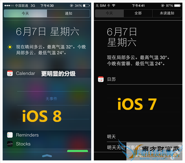 在 iOS 7 发布之后,小编就有一个疑问,究竟 iOS 7 中通知中心的“全部”和“未读通知”的独立存在的意义是什么。而在 iOS 8,苹果也似乎采用了用户的建议,将上述两个合二为一,变成“通知”。在 iOS 8 中,每一个项目的分类更加明显,通过加深每个分类的颜色来让视图更为直观。而顶部的编辑按钮,可以让你直接在通知中心里对不想提醒的通知进行移除,例如股票,也可以根据喜欢调整先后顺序。