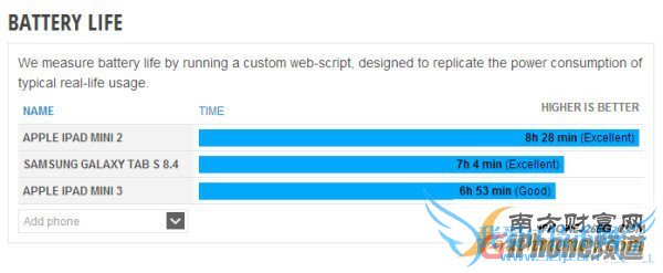一如往常,苹果官方并没有列出 iPad mini 3 的电池参数,但外媒基于前后两代平板的机身尺寸没有太大变化考虑,初步推测后者与前者的电池容量基本相同。外媒采用了与 iPad Air 2 电池续航测试相同的条件,结果出人意料的发现 iPad mini 3 的续航时长仅为 6 小时 28 份,比前代平板的电池续航时间仍然少了 1 小时 35 分钟,如此大的差异显然推。翻了此前的预测。