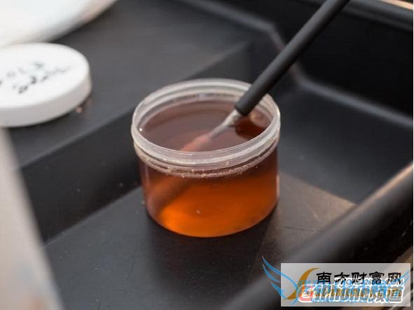 接下来,就可以涂抹镀金涂层了,这就是镀金涂层的样子。Goldgenie解释说,公司使用了24K高浓度纯金溶解形成涂层,最终可以实现每升12毫克黄金含量。