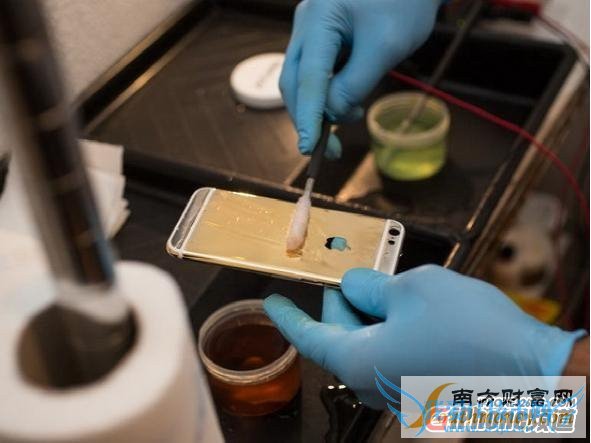 涂抹镀金涂层之后,后盖的颜色渐渐开始发生变化,“土豪”风格慢慢形成了。另外,还需要不断使用纯净水冲洗,使涂层逐渐稳定,最终将iPhone6后盖的表面、边缘完全涂抹,这个过程十分费时费力。