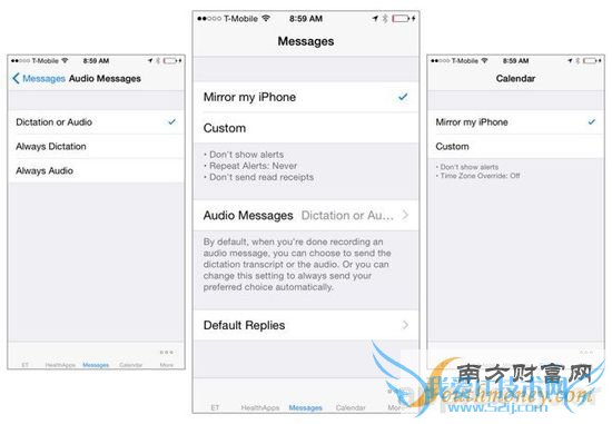 用户可以完全复制他们对自己的iPhone进行的信息配置,或进行自定义设置。比如,用户可以启用或禁用信息提醒或重复提醒等,可以与iPhone配置的规则完全分开。