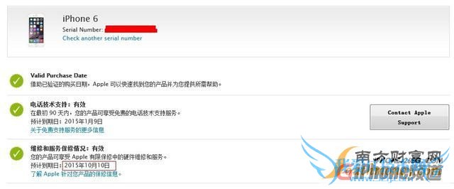 由于iPhone6是从激活日起保修一年的,从图中,我们可以看到iPhone6 Plus保修到期时间是2015年10月10日,如果这这个日期与购入后的激活时间相差一年,就可以判断属于正品行货新机。